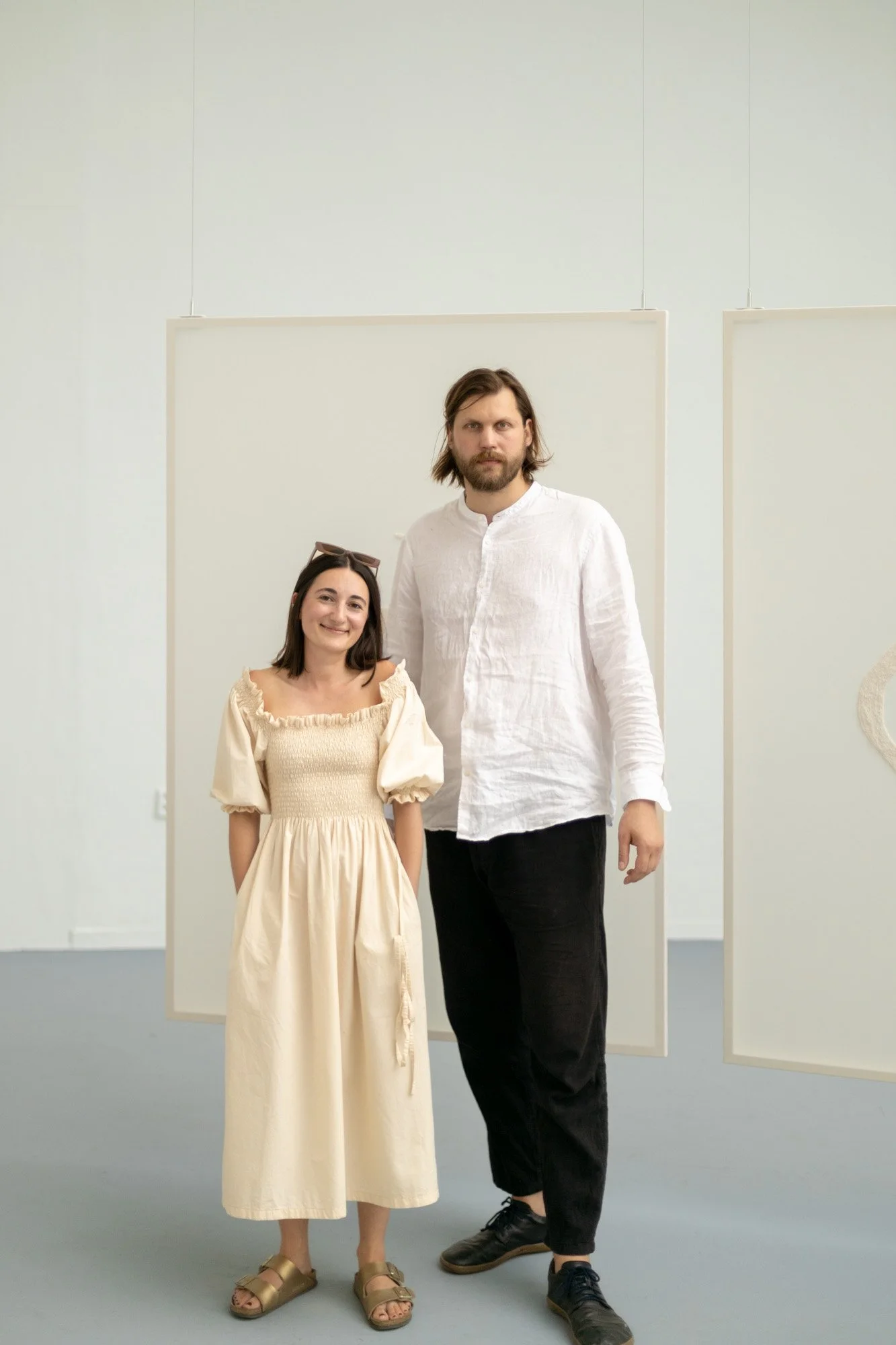Her public work includes a bronze sculpture for Telegrafia in Košice. Exhibitions include Curator Contemporary (Nuance of Breath) and the group show Pomezí identity (Vsetín). Her diploma installation uses breath as a working method to shape non-anatomical bodies and unfolds an intimate mother–daughter narrative across five monochrome embroideries and two sculptures that balance fragility and firmness.
