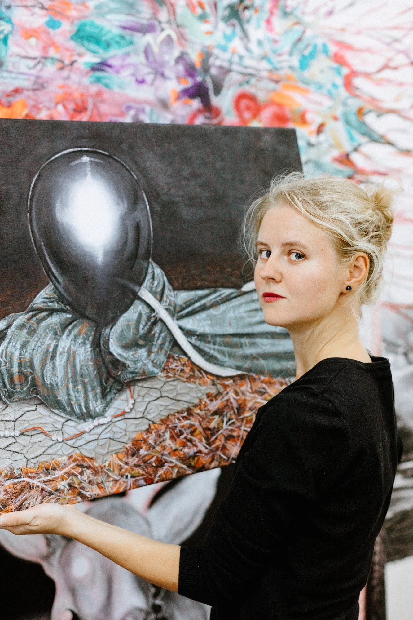 The painting comes from an extensive cycle titled Plastic World. In this world, boundaries do not exist — everything can be reshaped into any form. Head of the Labuza is the result of a synthesis between Medusa and a swan, creating a kind of plastic emblem of the contemporary era.